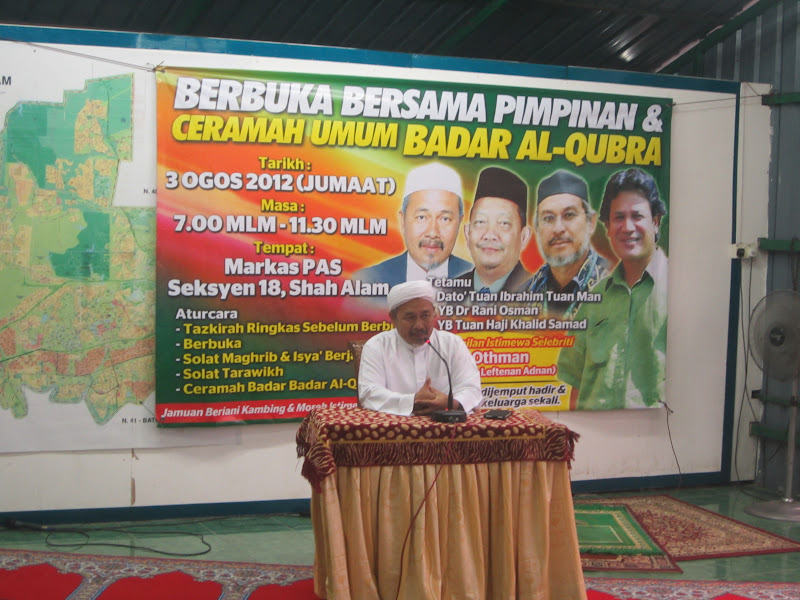 Ceramah Umum bertajuk Badar Al Kubra telah diadakan di Markaz Pas Seksyen 18. Penceramah terdiri dari YB Khalid Samad, Dato Tuan Ibrahim Tuan Man, Saudara Hairie Othman dan YB Dr Hj Abd Rani bin Osman.